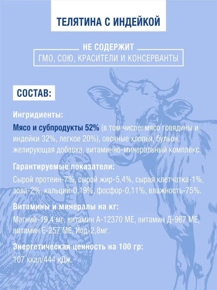 Мясо и субпродукты 52% ( в том числе : мясо говядины и индейки 32%, легкое 20%), овсяные хлопья, бульон, желирующая добавка, сырой протеин -7%, сырой жир -5,4%, сырая клетчатка -1%, зола-2%, Витамины и минералы на кг : Магний -19,4 мг, витамин А -12370 МЕ, витамин Д -967 МЕ, витамин Е -257 МЕ, Йод -2,8мг