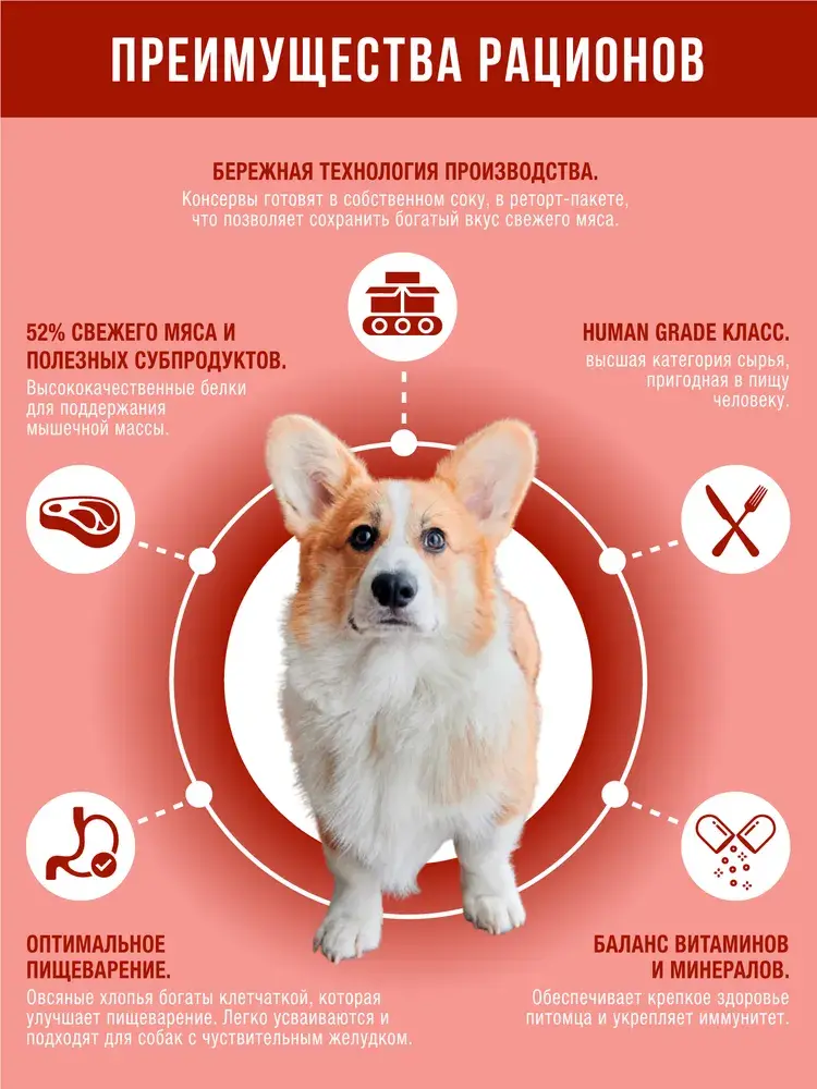 Полнорационное питание класса HUMAN GRADE с 52% свежего натурального мяса. Разработано экспертами ветеринарной диетологии для повседневного кормления.