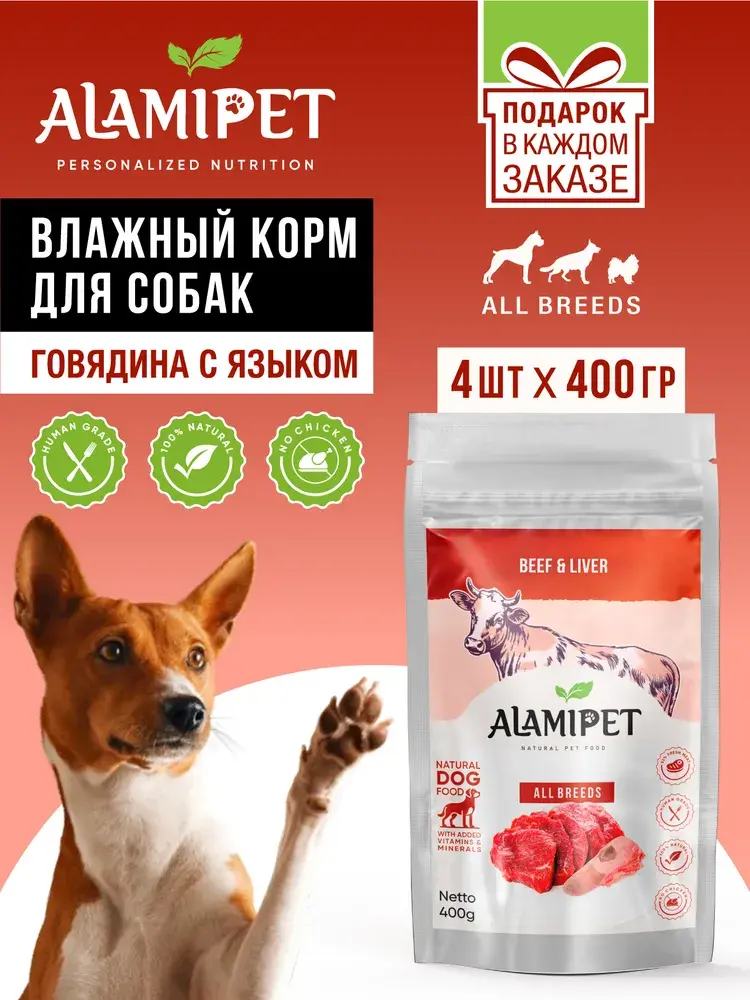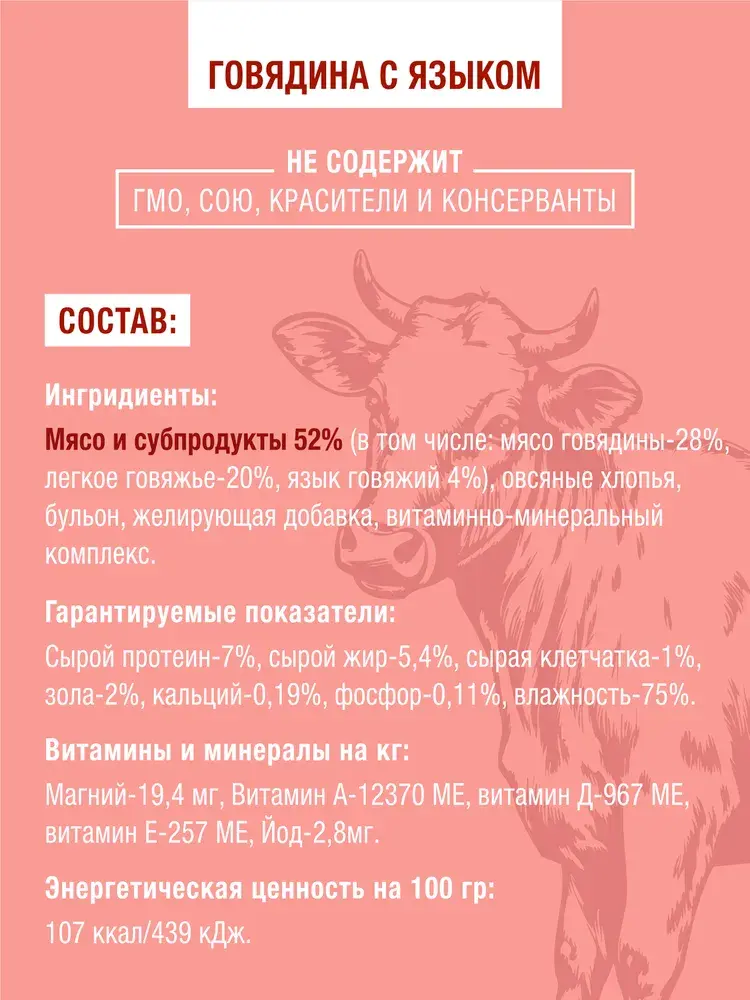 · Говяжий язык (4%) - деликатесный субпродукт, богат белком, цинком и витамином В12, улучшает вкусовые качества корма;