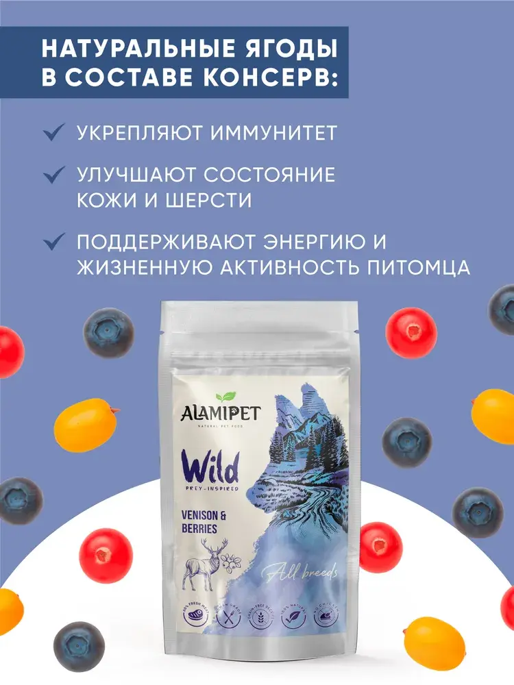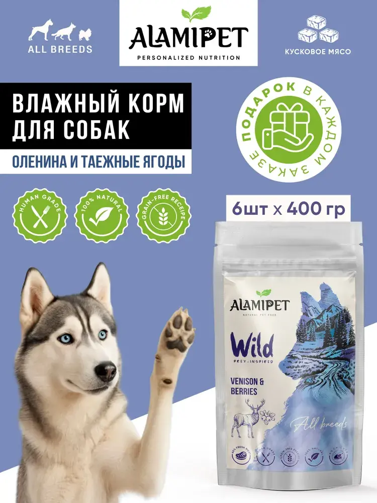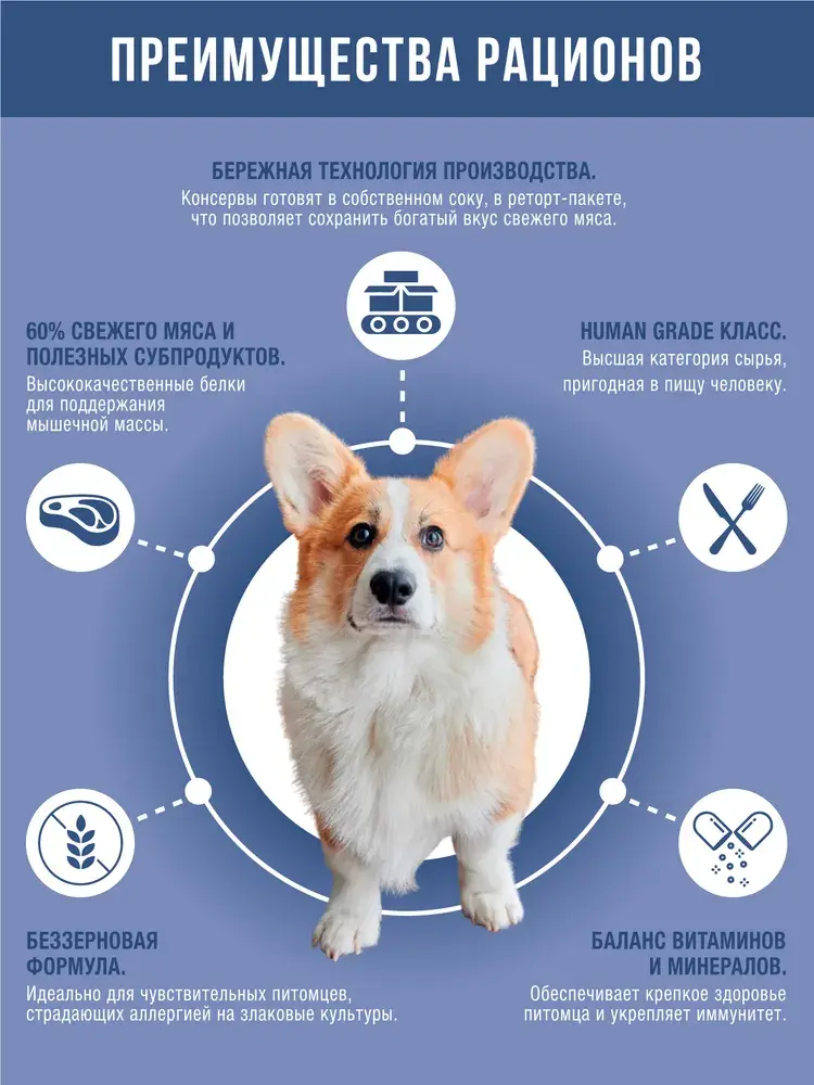 Полнорационное беззерновое питание класса HUMAN GRADE с 60% натурального мяса оленины и телятины. Разработано экспертами ветеринарной диетологии специально для собак с пищевой чувствительностью и аллергией на злаки.