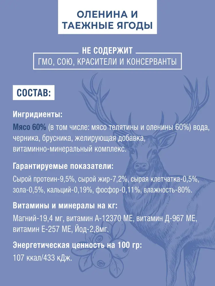 Мясо и субпродукты 60% ( в том числе: мясо телятины и оленины 60%) вода, черника, брусника, желирующая добавка, витаминно-минеральный комплекс. Сырой протеин -9,5%, сырой жир -7,2%, сырая клетчатка -0,5%, зола-0,5%, кальций -0,19%, фосфор -0,11%, влажность -80%. Магний -19,4 мг, витамин А -12370 МЕ, витамин Д -967 МЕ, витамин Е -257 МЕ, Йод -2,8мг.