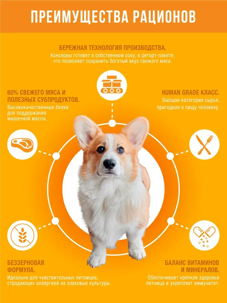 Полнорационное беззерновое питание класса HUMAN GRADE с 60% натурального мяса. Разработано экспертами ветеринарной диетологии специально для собак с пищевой чувствительностью и аллергией на злаки.