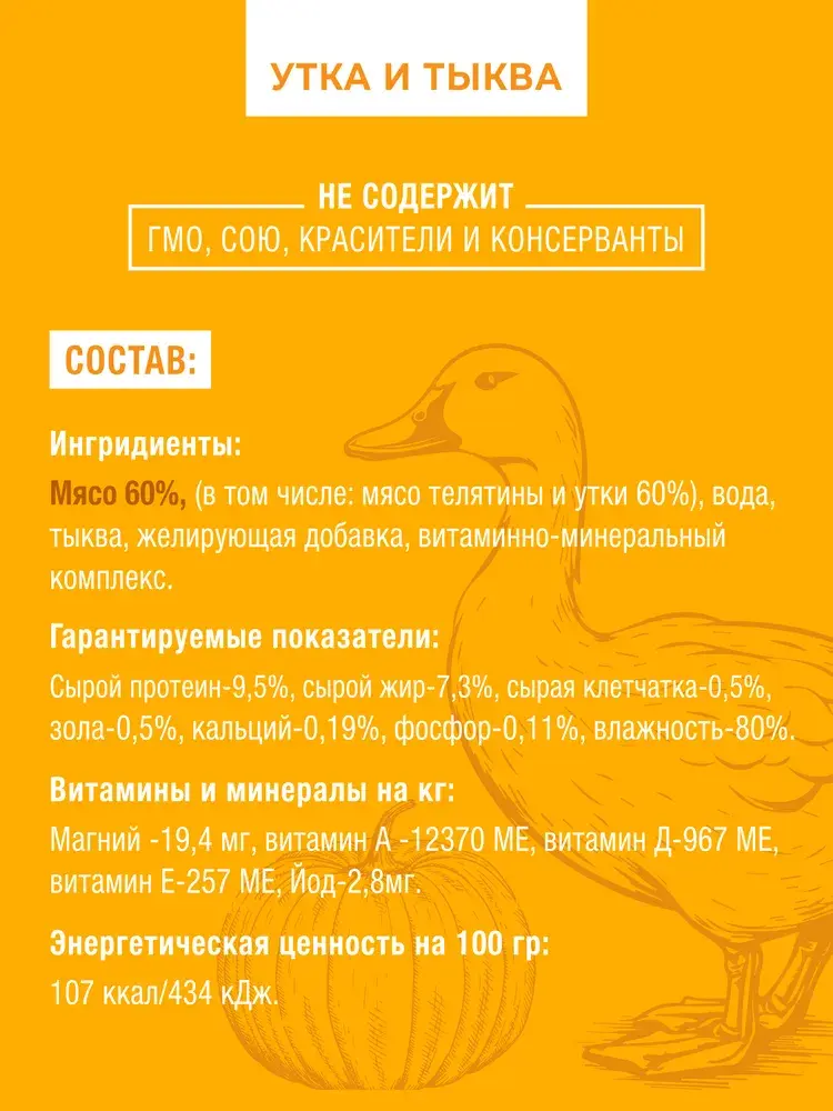 Мясо 60% ( в том числе: мясо телятины и утки 60%),вода, тыква, желирующая добавка, витаминно-минеральный комплекс. Сырой протеин -9,5%, сырой жир -7,3%, сырая клетчатка -0,5%, зола-0,5%, кальций -0,19%, фосфор -0,11%, влажность -80%. Магний -19,4 мг, витамин А -12370 МЕ, витамин Д -967 МЕ, витамин Е -257 МЕ, Йод -2,8мг.