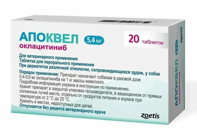Апоквел относится к группе селективных ингибиторов янус-киназы (JAK). Оклацитиниб в терапевтической дозе угнетает функции провоспалительных, проаллергических и пруритогенных (зудогенных) цитокинов, зависимых от ферментативной активности янус-киназы JAK1 или JAK3. Это позволяет ингибировать ключевые механизмы возникновения зуда, ассоциированного с аллергией, и способствует устранению симптомов местного воспаления. На цитокины, участвующие в кроветворении и зависимые от JAK2, препарат существенно не влияет. market.yandex.ru +1