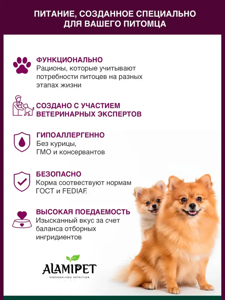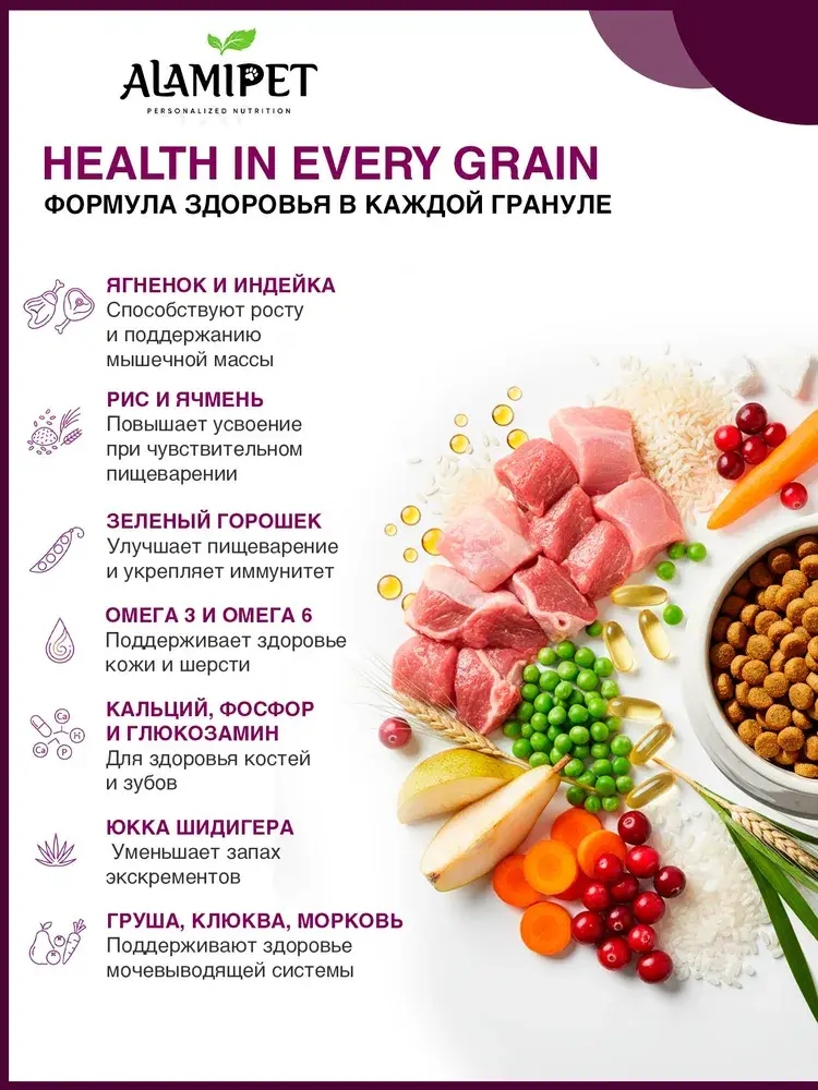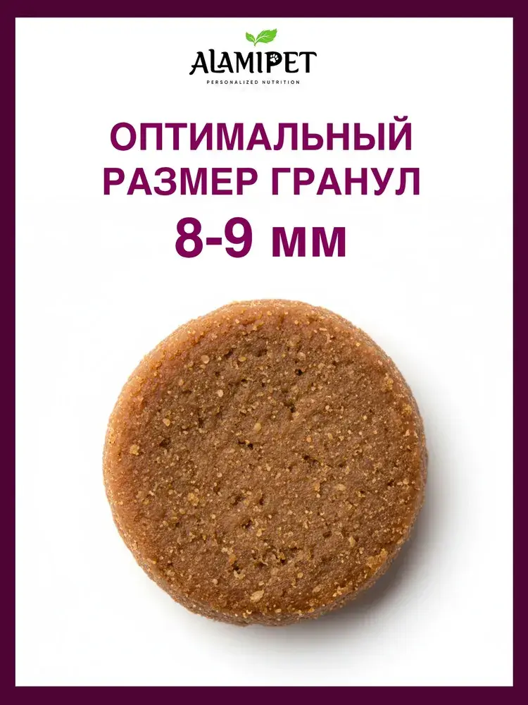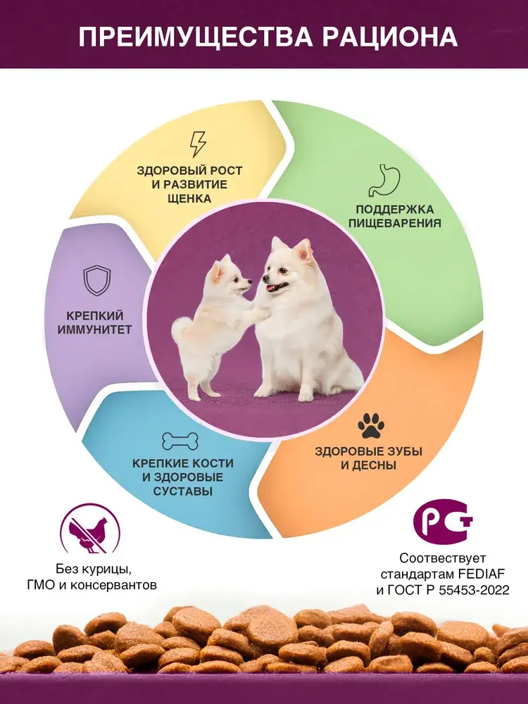 Гарантии качества. Гипоаллергенный состав: ягненок — диетический белок, редко вызывающий аллергию. Без курицы, ГМО и консервантов. Соответствует FEDIAF и ГОСТ Р 55453-2022. Оптимальный размер гранул 8-9 мм для челюстей мелких пород.