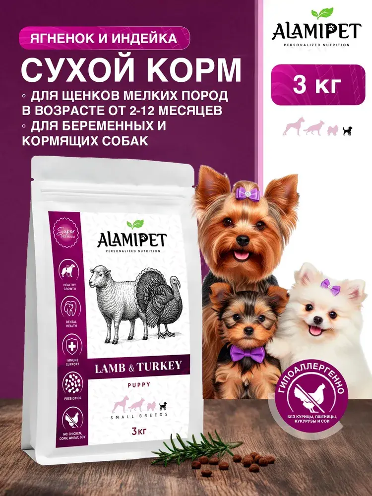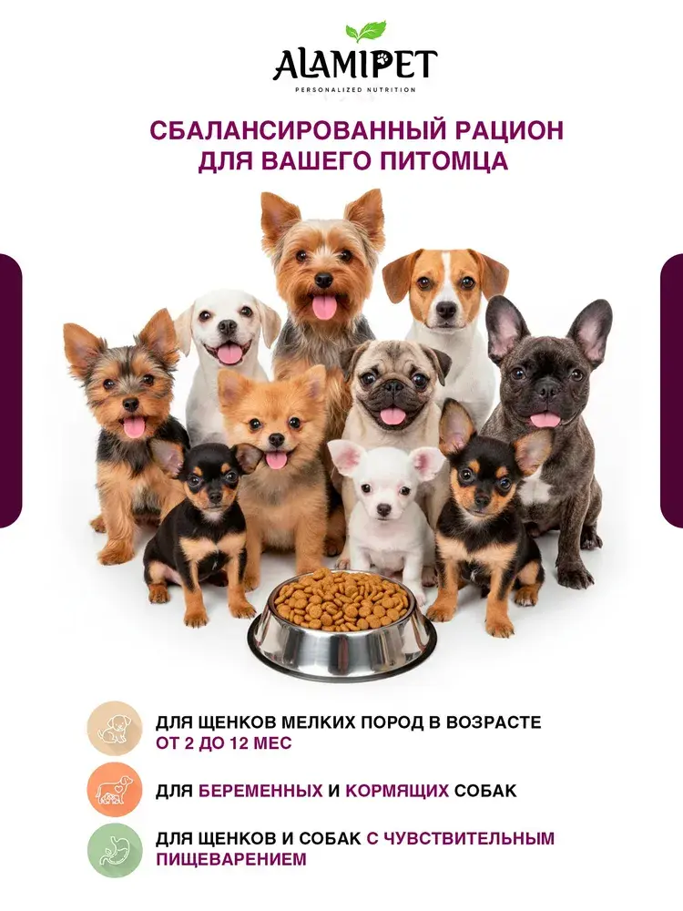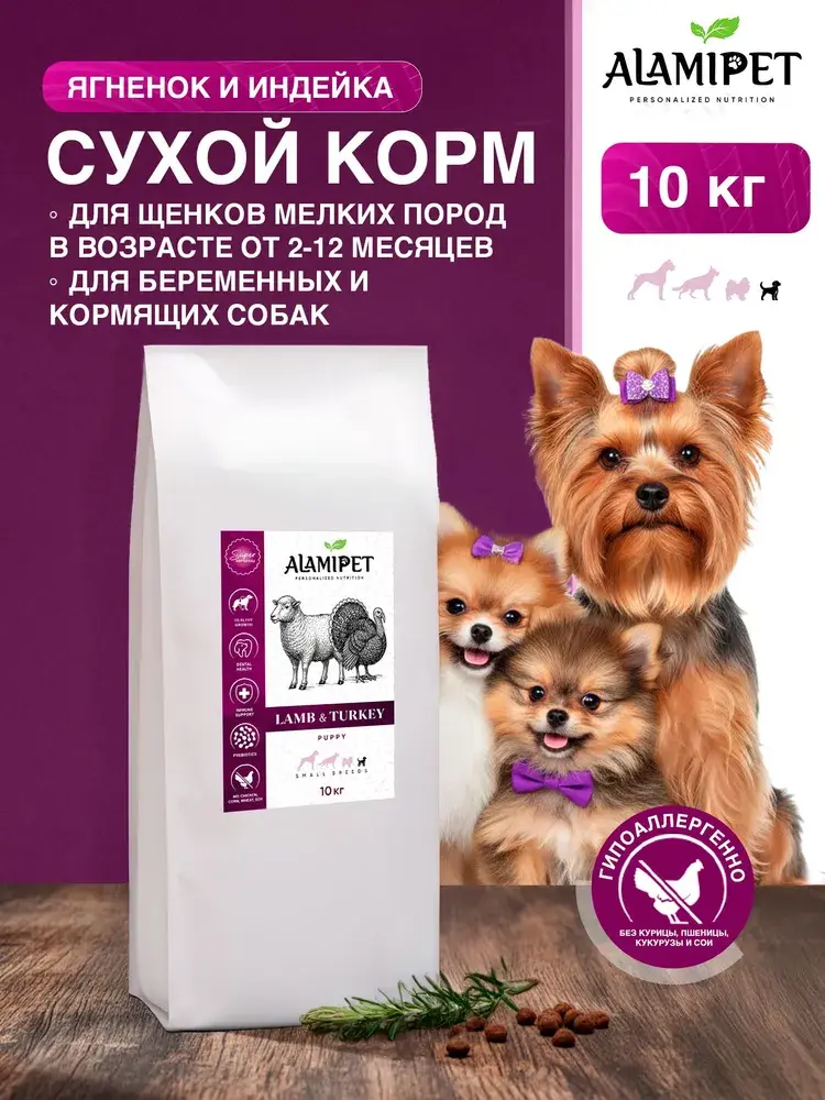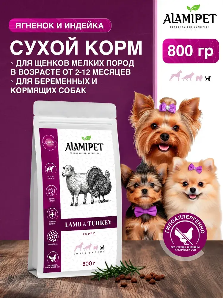 Пакет с сухим полнорационным кормом суперпремиум класса ALAMIPET с ягненком и индейкой для щенков мелких пород в возрасте от 2 ух до 12 мес, а также для беременных и кормящих собак.