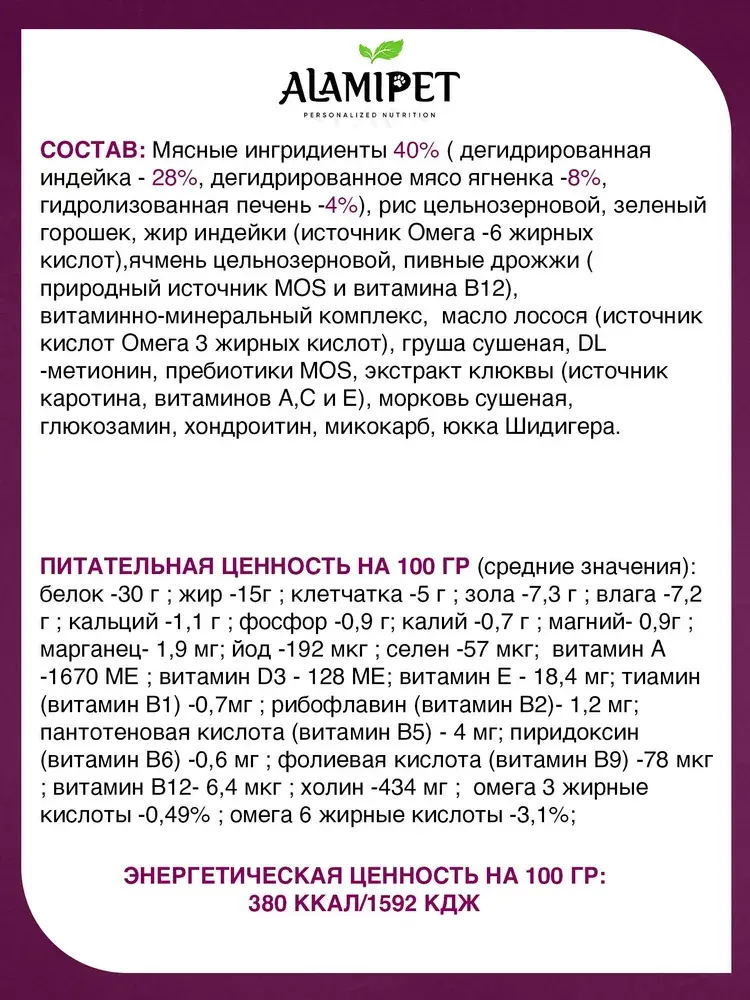 Мясные ингридиенты 40% ( дегидрированная индейка - 28%, дегидрированное мясо ягненка -8%, гидролизованная печень -4%), рис цельнозерновой, зеленый горошек, жир индейки (источник Омега -6 жирных кислот),ячмень цельнозерновой, пивные дрожжи ( природный источник MOS и витамина B12), витаминно-минеральный комплекс, масло лосося (источник кислот Омега 3 жирных кислот), груша сушеная, DL -метионин, пребиотики МOS, экстракт клюквы (источник каротина, витаминов А,С и Е), морковь сушеная, глюкозамин, хондроитин, микокарб, юкка Шидигера. Питательная ценность на 100 гр (средние значения): белок -30 г ; жир -15г ; клетчатка -5 г ; зола -7,3 г ; влага -7,2 г ; кальций -1,1 г ; фосфор -0,9 г; калий -0,7 г ; магний- 0,9г ; марганец- 1,9 мг; йод -192 мкг ; селен -57 мкг; витамин А -1670 МЕ ; витамин D3 - 128 МЕ; витамин Е - 18,4 мг; тиамин (витамин B1) -0,7мг ; рибофлавин (витамин B2)- 1,2 мг; пантотеновая кислота (витамин B5) - 4 мг; пиридоксин (витамин B6) -0,6 мг ; фолиевая кислота (витамин B9) -78 мкг ; витамин B12- 6,4 мкг ; холин -434 мг ; омега 3 жирные кислоты -0,49% ; омега 6 жирные кислоты -3,1%.